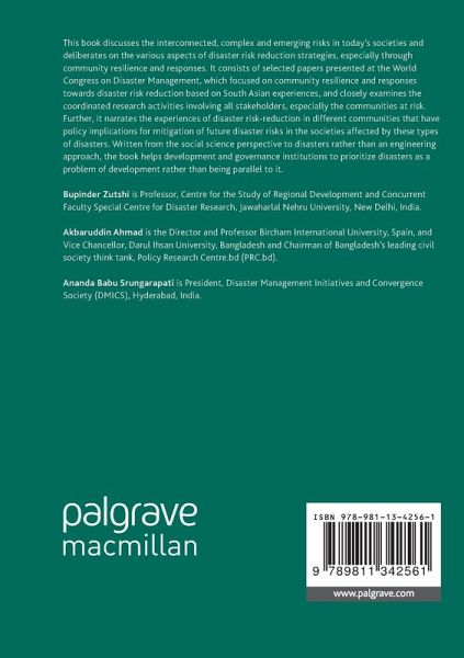 This book discusses the interconnected, complex and emerging risks in today's societies and deliberates on the various aspects of disaster risk reduction strategies especially through community resilience and responses. It consists of selected papers presented at the World Congress on Disaster Management, which focused on community resilience and responses towards disaster risk reduction based on South Asian experiences, and closely examines the coordinated research activities involving all stakeholders, especially the communities at risk. Further, it narrates the experiences of disaster…mehr