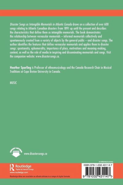 Disaster Songs as Intangible Memorials in Atlantic Canada is also exceptionally well written. Sparling offers a balance between anecdotes, which draw in the reader, and clear exposition of factual detail to support her argument. Her use of the characteristics of vernacular memorials as an organizational scheme for chapter topics, and her choice to begin with Maurice Ruddick's song about the Springhill Mine disaster and to conclude with a song written by his great-granddaughter, also contribute to the book's sense of cohesion. This book will be useful to those in many disciplines, including ethnomusicology, folklore, anthropology, and media studies.