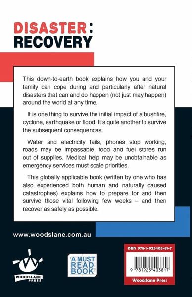 Disaster: Recovery is a down-to-earth book that explains how you and your family can cope during and particularly after disasters such as floods, bushfires and typhoons that can and do happen (not just may happen) around the world at any time. It is one thing to survive the initial impact of a disaster. It’s quite another to survive the subsequent fallout. Water and electricity may fail, phones may stop working, roads may be impassable, food and fuel stores often run out of supplies. Medical help may be unobtainable as emergency services must scale priorities. This globally applicable book…mehr
