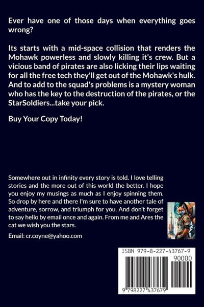 Ever have one of those days when everything goes wrong? Its starts with a mid-space collision that renders the Mohawk powerless and slowly killing it's crew. But a vicious band of pirates are also licking their lips waiting for all the free tech they'll get out of the Mohawk's hulk. And to add to the squad's problems is a mystery woman who has the key to the destruction of the pirates, or the StarSoldiers...take your pick.
