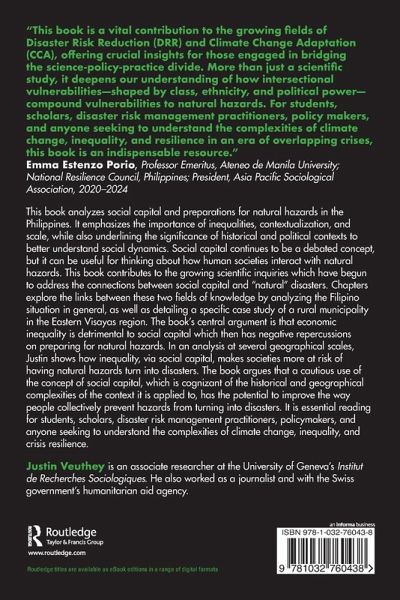 This book analyzes social capital and preparations for natural hazards in the Philippines. It emphasizes the importance of inequalities, contextualization, and scale, while also underlining the significance of historical and political contexts to better understand social dynamics. Social capital continues to be a debated concept, but it can be useful for thinking about how human societies interact with natural hazards. This book contributes to the growing scientific inquiries which have begun to address the connections between social capital and "natural" disasters. Chapters explore the links between these two fields of knowledge by analyzing the Filipino situation in general, as well as detailing a specific case study of a rural municipality in the Eastern Visayas region. The book's central argument is that economic inequality is detrimental to social capital which then has negative repercussions on preparing for natural hazards. In an analysis at several geographical scales, Justin shows how inequality, via social capital, makes societies more at risk of having natural hazards turn into disasters. The book argues that a cautious use of the concept of social capital, which is cognizant of the historical and geographical complexities of the context it is applied to, has the potential to improve the way people collectively prevent hazards from turning into disasters. It is essential reading for students, scholars, disaster risk management practitioners, policymakers, and anyone seeking to understand the complexities of climate change, inequality, and crisis resilience.