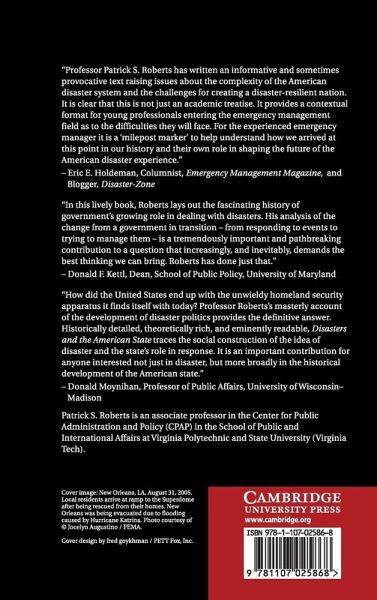 Disasters and the American State offers a thesis about the trajectory of federal government involvement in preparing for disaster shaped by contingent events. Politicians and bureaucrats claim credit for the government's successes in preparing for and responding to disaster, and they are also blamed for failures outside of government's control. New interventions have created precedents and established organizations and administrative cultures that accumulated over time and produced a general trend in which citizens, politicians and bureaucrats expect the government to provide more security from more kinds of disasters. The trend reached its peak when the Federal Emergency Management Agency adopted the idea of preparing for 'all hazards' as its mantra. Despite the rhetoric, however, the federal government's increasingly bold claims and heightened public expectations are disproportionate to the ability of the federal government to prevent or reduce the damage caused by disaster.