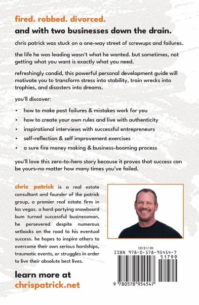 Fired, robbed, divorced, and with two businesses down the drain, Chris Patrick was stuck on a one-way street of screwups and failures. The life he was leading wasn't what he wanted-but sometimes, not getting what you want is exactly what you need. Disaster to Dreams is the story of one man's biggest catastrophes and greatest comebacks, but it's also a story that demonstrates how amazing opportunities lie just on the other side of adversity-if you're willing to do the dirty work and dig through defeat. Refreshingly candid, this tough-love and unfiltered self-improvement guide will motivate you to transform stress into stability, train wrecks into trophies, and disasters into dreams. You'll discover:The ultimate personal growth mindset to help you create your own rules and master life-changing manifestation. Interviews with entrepreneurs, full of inspiration to help you power through any obstacle. How to swallow your "bad" pride and ask people for help-because sometimes finding your purpose takes some hand-holding. Self-reflection exercises to unearth the seeds to future success in the dirt of your past. A step-by-step business-booming process that can improve your subpar enterprise into a prosperous empire. Build triumph on the foundation of failure. No path is a dead end, no matter how epic your mess of defeat. Get Disasters to Dreams and prepare for a path of limitless opportunity in your perfect storm of success!