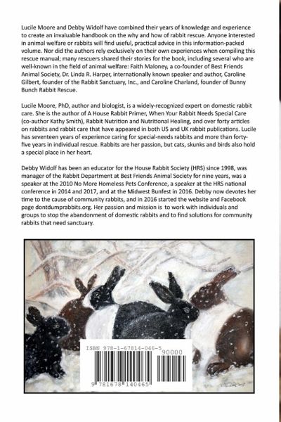 Discarded Rabbits is a compendium of information on rabbit rescue for both experienced rescuers and those who have never before rescued a rabbit. Topics covered include: why rabbits are abandoned, how to capture dumped rabbits, triage for rescued rabbits, common parasites and how to treat them, rabbit housing, feeding rabbits, educating people about rabbits, and how to work with volunteers and community officials. Information on these and other practical topics is interspersed with compelling and poignant rescue stories.