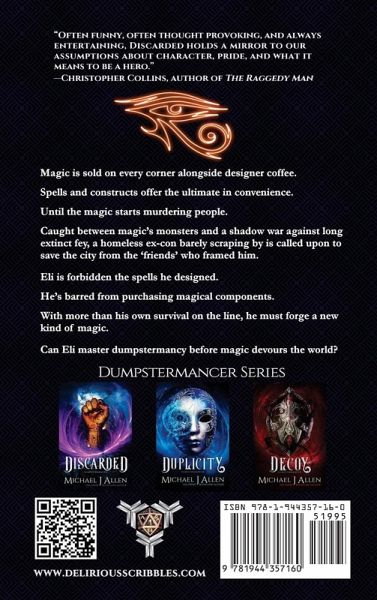 Magic has been franchised. Magical conveniences are sold everywhere like designer coffee. Everyday life is filled with technical and magical wonders. Only, the magic is murdering people. Thoth Corp's hot new spell is turning people into ravening monsters. Their only hope to quietly rectify the situation before the epidemic spreads is the spell architect they framed and sent to prison. Eli's response to his former partners wasn't polite. Homeless, forbidden government-regulated magic and barely surviving out of dumpsters, Eli struggles to rebuild his life. Fairytale rats thought long extinct with the rest of the fey rescue Eli from murderous Vigilantes, but at a cost. They force him to save fairy matrons stolen away by Thoth's monsters, thrusting Eli between his old company and a shadow war waged against humanity. To stop the war, cure Thoth's victims and rescue the city, Eli need only find some way to make magic out of trash.