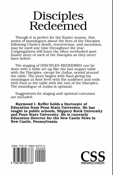 Though it is perfect for the Easter season, this series of monologues about the lives of the disciples following Christ's death, resurrection, and ascension, may be used any time throughout the year. Congregations will learn the often overlooked post-Easter story of each of the disciples as they never have before. The staging of Disciples Redeemed can be one with a table set up like the last supper table with the disciples, except for Judas, seated around the table. The story begins with Saul giving his monologue at floor level with the audience and ends with Paul at the table with the rest of the Disciples. The monologue of Judas is optional. Suggestions for staging and optional costumes are included. Raymond I. Keffer holds a Doctorate of Education from Penn State University. He has taught in public schools, Slippery Rock University and Penn State University. He is currently Education Director for the New Castle News in New Castle, Pennsylvania.