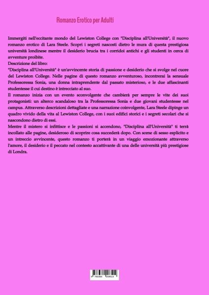 Immergiti nell'eccitante mondo del Lewiston College con "Disciplina all'Università", il nuovo romanzo erotico di Lara Steele. Scopri i segreti nascosti dietro le mura di questa prestigiosa università londinese mentre il desiderio brucia tra i corridoi antichi e gli studenti in cerca di avventure proibite.Descrizione del libro:"Disciplina all'Università" è un'avvincente storia di passione e desiderio che si svolge nel cuore del Lewiston College. Nelle pagine di questo romanzo avventuroso, incontrerai la sensuale Professoressa Sonia, una donna intraprendente dal passato misterioso, e le due affascinanti studentesse il cui destino è intrecciato al suo.Il romanzo inizia con un evento sconvolgente che cambierà per sempre le vite dei suoi protagonisti: un alterco scandaloso tra la Professoressa Sonia e due giovani studentesse nel campus. Attraverso descrizioni dettagliate e una narrazione coinvolgente, Lara Steele dipinge un quadro vivido della vita al Lewiston College, con i suoi edifici storici e i segreti secolari che si nascondono dietro di essi.Mentre il mistero si infittisce e le passioni si accendono, "Disciplina all'Università" ti terrà incollato alle pagine, desideroso di scoprire cosa succederà dopo. Con scene di sesso esplicito e un intreccio avvincente, questo romanzo ti porterà in un viaggio emozionante attraverso l'amore, il desiderio e il peccato nel contesto accattivante di una delle università più prestigiose di Londra.Scopri ora "Disciplina all'Università" e lasciati trasportare in un mondo di piacere e intrighi al Lewiston College.