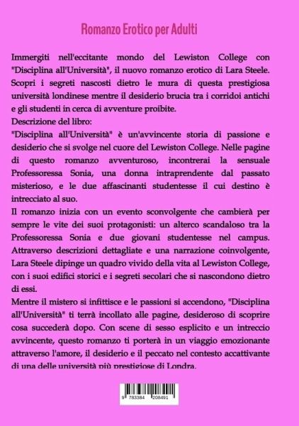 Immergiti nell'eccitante mondo del Lewiston College con "Disciplina all'Università", il nuovo romanzo erotico di Lara Steele. Scopri i segreti nascosti dietro le mura di questa prestigiosa università londinese mentre il desiderio brucia tra i corridoi antichi e gli studenti in cerca di avventure proibite.Descrizione del libro:"Disciplina all'Università" è un'avvincente storia di passione e desiderio che si svolge nel cuore del Lewiston College. Nelle pagine di questo romanzo avventuroso, incontrerai la sensuale Professoressa Sonia, una donna intraprendente dal passato misterioso, e le due affascinanti studentesse il cui destino è intrecciato al suo.Il romanzo inizia con un evento sconvolgente che cambierà per sempre le vite dei suoi protagonisti: un alterco scandaloso tra la Professoressa Sonia e due giovani studentesse nel campus. Attraverso descrizioni dettagliate e una narrazione coinvolgente, Lara Steele dipinge un quadro vivido della vita al Lewiston College, con i suoi edifici storici e i segreti secolari che si nascondono dietro di essi.Mentre il mistero si infittisce e le passioni si accendono, "Disciplina all'Università" ti terrà incollato alle pagine, desideroso di scoprire cosa succederà dopo. Con scene di sesso esplicito e un intreccio avvincente, questo romanzo ti porterà in un viaggio emozionante attraverso l'amore, il desiderio e il peccato nel contesto accattivante di una delle università più prestigiose di Londra.Scopri ora "Disciplina all'Università" e lasciati trasportare in un mondo di piacere e intrighi al Lewiston College.