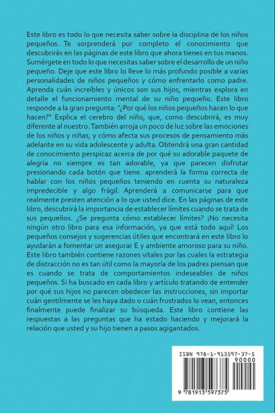 Este libro es todo lo que necesita saber sobre la disciplina de los niños pequeños. Te sorprenderá por completo el conocimiento que descubrirás en las páginas de este libro que ahora tienes en tus manos. Sumérgete en todo lo que necesitas saber sobre el desarrollo de un niño pequeño. Deje que este libro lo lleve lo más profundo posible a varias personalidades de niños pequeños y cómo enfrentarlo como padre. Aprenda cuán increíbles y únicos son sus hijos, mientras explora en detalle el funcionamiento mental de su niño pequeño. Este libro responde a la gran pregunta: "¿Por qué los niños pequeños hacen lo que hacen?" Explica el cerebro del niño, que, como descubrirá, es muy diferente al nuestro. También arroja un poco de luz sobre las emociones de los niños y niñas, y cómo afecta sus procesos de pensamiento más adelante en su vida adolescente y adulta. Obtendrá una gran cantidad de conocimiento perspicaz acerca de por qué su adorable paquete de alegría no siempre es tan adorable, ya que parecen disfrutar presionando cada botón que tiene. aprenderá la forma correcta de hablar con los niños pequeños teniendo en cuenta su naturaleza impredecible y algo frágil. Aprenderá a comunicarse para que realmente presten atención a lo que usted dice. En las páginas de este libro, descubrirá la importancia de establecer límites cuando se trata de sus pequeños. ¿Se pregunta cómo establecer límites? ¡No necesita ningún otro libro para esa información, ya que está todo aquí! Los pequeños consejos y sugerencias útiles que encontrará en este libro lo ayudarán a fomentar un asegurar E y ambiente amoroso para su niño. Este libro también contiene razones vitales por las cuales la estrategia de distracción no es tan útil como la mayoría de los padres piensan que es cuando se trata de comportamientos indeseables de niños pequeños. Si ha buscado en cada libro y artículo tratando de entender por qué sus hijos no parecen obedecer las instrucciones, sin importar cuán gentilmente se les haya dado o cuán frustrados lo vean, entonces finalmente puede finalizar su búsqueda. Este libro contiene las respuestas a las preguntas que ha estado haciendo y mejorará la relación que usted y su hijo tienen a pasos agigantados.