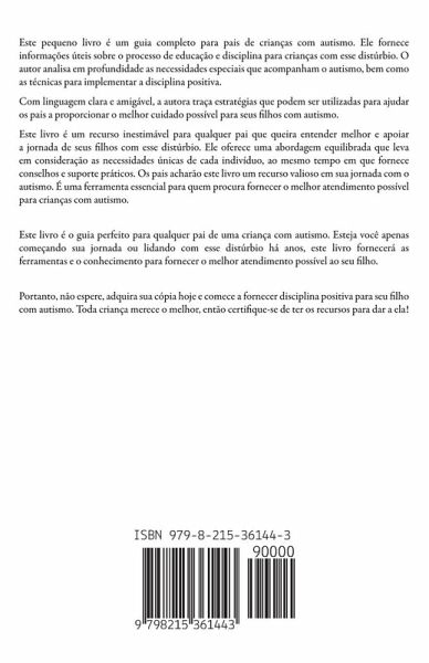 Este pequeno livro é um guia completo para pais de crianças com autismo. Ele fornece informações úteis sobre o processo de educação e disciplina para crianças com esse distúrbio. O autor analisa em profundidade as necessidades especiais que acompanham o autismo, bem como as técnicas para implementar a disciplina positiva. Com linguagem clara e amigável, a autora traça estratégias que podem ser utilizadas para ajudar os pais a proporcionar o melhor cuidado possível para seus filhos com autismo. Este livro é um recurso inestimável para qualquer pai que queira entender melhor e apoiar a jornada de seus filhos com esse distúrbio. Ele oferece uma abordagem equilibrada que leva em consideração as necessidades únicas de cada indivíduo, ao mesmo tempo em que fornece conselhos e suporte práticos. Os pais acharão este livro um recurso valioso em sua jornada com o autismo. É uma ferramenta essencial para quem procura fornecer o melhor atendimento possível para crianças com autismo. Este livro é o guia perfeito para qualquer pai de uma criança com autismo. Esteja você apenas começando sua jornada ou lidando com esse distúrbio há anos, este livro fornecerá as ferramentas e o conhecimento para fornecer o melhor atendimento possível ao seu filho. Portanto, não espere, adquira sua cópia hoje e comece a fornecer disciplina positiva para seu filho com autismo. Toda criança merece o melhor, então certifique-se de ter os recursos para dar a ela!