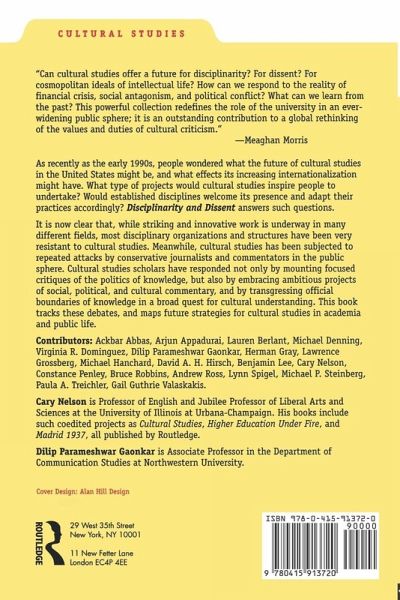 First published in 1996. As recently as the early 1990s, people wondered what was the future of cultural studies in the United States and what effects its increasing internationalization might have. What type of projects would cultural studies inspire people to undertake? Would established disciplines welcome its presence and adapt their practices accordingly? Disciplinarity and Dissent in Cultural Studies answers such questions.BR>BR>It is now clear that, while striking and innovative work is underway in many different fields, most disciplinary organizations and structures have been very resistant to cultural studies. Meanwhile, cultural studies has been subjected to repeated attacks by conservative journalists and commentators in the public sphere. Cultural studies scholars have responded not only by mounting focused critiques of the politics of knowledge but also by embracing ambitious projects of social, political, and cultural commentary, by transgressing all the official boundaries of knowledge in a broad quest for cultural understanding. This book tracks these debates and maps future strategies for cultural studies in academia and public life.BR>BR>The contributors to Disciplinarity and Dissent in Cultural Studies include established scholars and new voices. In a series of polemic and exploratory essays written especially for this book, they track the struggle with cultural studies in disciplines like anthropology, literature and history; and between cultural studies and very different domains like Native American culture and the culture of science.BR>BR>Contributors include Arjun Appadurai, Michael Denning, Lawrence Grossberg, Cary Nelson, Constance Penley, Andrew Ross, and Lynn Spigel.