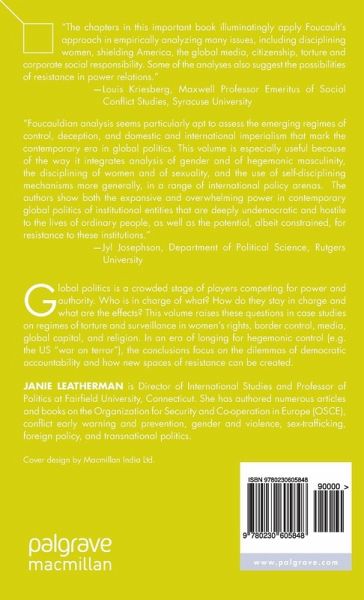 "Foucauldian analysis seems particularly apt to assess the emerging regimes of control, deception, and domestic and international imperialism that mark the contemporary era in global politics. This volume is especially useful because of the way it integrates analysis of gender and of hegemonic masculinity, the disciplining of women and of sexuality, and the use of self-disciplining mechanisms more generally, in a range of international policy arenas. The authors show both the expansive and overwhelming power in contemporary global politics of institutional entities that are deeply undemocratic and hostile to the lives of ordinary people, as well as the potential, albeit constrained, for resistance to these institutions." - Jyl Josephson, Director of Women s Studies and associate professor of political science, Rutgers University, Newark