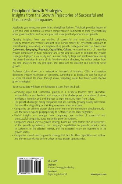 Drawing insights from case studies of successful and unsuccessful companies, strategy teacher and venture capitalist Peter Cohan models his systematic approach to brainstorming, evaluating, and implementing growth strategies across five dimensions: Customers, Geography, Products, Capabilities, Culture. He examines each of these five growth dimensions in turn, selecting and organizing his cases to compare the growth strategies deployed successfully and unsuccessfully by large and small companies along the given dimension. In each of his five dimensional chapters, the author derives from his case analyses the key principles and processes for creating and achieving faster growth.