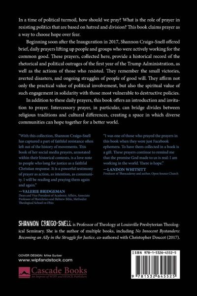 In a time of political turmoil, how should we pray? What is the role of prayer in resisting politics that are based on hatred and division? This book claims prayer as a way to choose hope over fear. Beginning soon after the Inauguration in 2017, Shannon Craigo-Snell offered brief, daily prayers lifting up people and groups who were actively working for the common good. These prayers, collected here, provide a historical record of the rhetorical and political outrages of the first year of the Trump Administration, as well as the actions of those who resisted. They remember the small victories, averted disasters, and ongoing struggles of people of good will. They affirm not only the practical value of political involvement, but also the spiritual value of such engagement in solidarity with those most vulnerable to destructive policies. In addition to these daily prayers, this book offers an introduction and invitation to prayer. Intercessory prayer, in particular, can bridge divides between religious traditions and cultural differences, creating a space in which diverse communities can hope together for a better world.