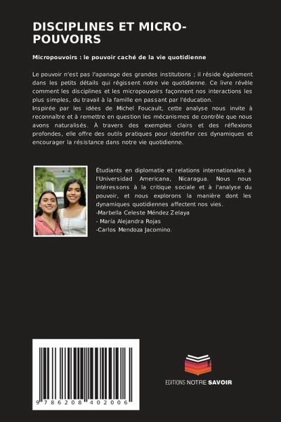 Micropouvoirs : le pouvoir caché de la vie quotidienneLe pouvoir n'est pas l'apanage des grandes institutions ; il réside également dans les petits détails qui régissent notre vie quotidienne. Ce livre révèle comment les disciplines et les micropouvoirs façonnent nos interactions les plus simples, du travail à la famille en passant par l'éducation.Inspirée par les idées de Michel Foucault, cette analyse nous invite à reconnaître et à remettre en question les mécanismes de contrôle que nous avons naturalisés. À travers des exemples clairs et des réflexions profondes, elle offre des outils pratiques pour identifier ces dynamiques et encourager la résistance dans notre vie quotidienne.