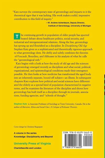 In Disciplining Old Age Stephen Katz gives us a sophisticated and theoretically rigorous approach to what gerentology does. He deftly and subtly combines the theories of Foucault, Bourdieu, and the Althusser in his analysis of what he calls the "gerontological web." Katz explores how political and social sciences have differentiated the elderly as a special kind of population characterized in negative terms, and he examines the literature of the discipline and shows how gerontology as built itself as a discipline through its journals, associations, funding agencies, and "schools of thought."