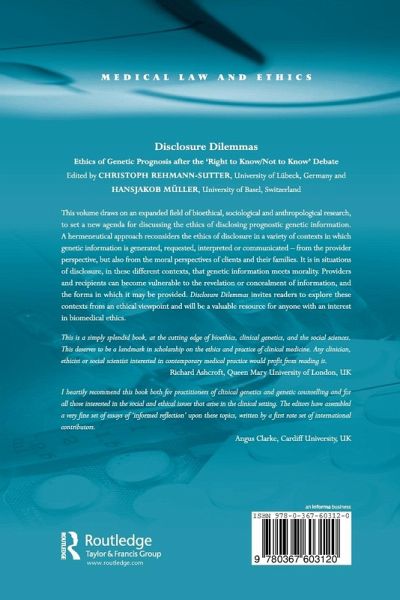 There exists today a fast growing availability of personal genetic information. Its prognostic impact and value for an individual or family member's health is sometimes unclear, whilst at other times it is clear-cut. The issue of whether to disclose genetic information does however have wide ranging implications. Avoiding the rhetoric of 'genetic exceptionalism', and drawing on an expanded field of bioethical, sociological and anthropological research, this book sets a new agenda for discussing the ethics surrounding the disclosure of prognostic genetic information. A hermeneutical approach reconsiders the ethics of disclosure in a variety of contexts in which genetic information is generated, requested, interpreted or communicated - from the provider perspective, but also from the moral perspectives of clients and their families. It is in situations of disclosure, in these different contexts, that genetic information meets morality. Providers and recipients can become vulnerable to the revelation or concealment of information, and the forms in which it may be provided. Disclosure Dilemmas invites readers to explore these contexts from an ethical viewpoint and will be a valuable resource for anyone with an interest in biomedical ethics.