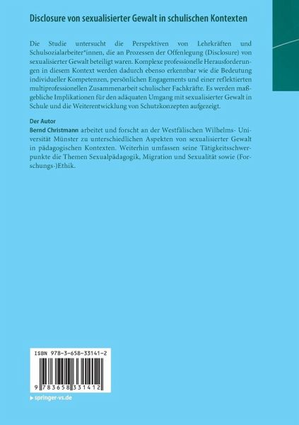 Die Studie untersucht die Perspektiven von Lehrkräften und Schulsozialarbeiter_innen, die an Prozessen der Offenlegung (Disclosure) von sexualisierter Gewalt beteiligt waren. Komplexe professionelle Herausforderungen in diesem Kontext werden dadurch ebenso erkennbar wie die Bedeutung individueller Kompetenzen, persönlichen Engagements und einer reflektierten multiprofessionellen Zusammenarbeit schulischer Fachkräfte. Es werden maßgebliche Implikationen für den adäquaten Umgang mit sexualisierter Gewalt in Schule und die Weiterentwicklung von Schutzkonzepten aufgezeigt.