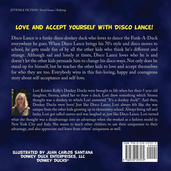 Love and Accept Yourself with Disco Lance! Disco Lance is funky disco donkey duck who loves to dance the Funk-A-Duck everywhere he goes. When Disco Lance brings his 70's style and disco moves to school, he gets made fun of by all the other kids who think he's different and strange. Although sad and lonely at times, Disco Lance loves who he is and doesn't let the other kids persuade him to change his disco ways. Not only does he stand up for himself, but he teaches the other kids to love and accept themselves for who they are too. Everybody wins in this happy and victorious story.