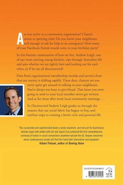 In this forensic examination of how we live, Andrew Leigh, one of our most exciting young thinkers, rips though Australian life and asks whether we are tightly-knit and looking out for each other, or are we all disconnected? Organisational membership records and surveys show that our society is shifting rapidly. These days, chances are you never quite get around to talking to your neighbours, or you're always too busy to give blood. In Disconnected Andrew Leigh guides us through the reasons that our social fabric has begun to fray, and outlines steps to creating a better civic and personal life.