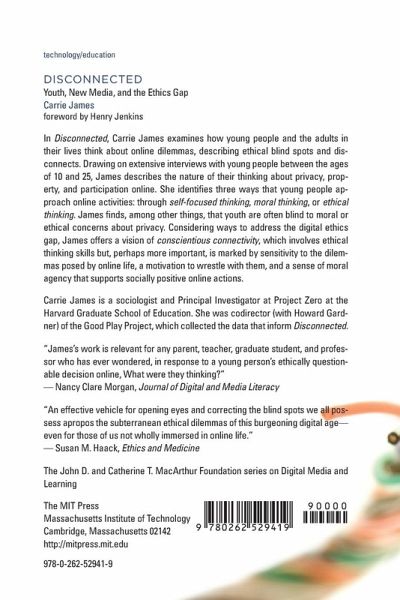 How young people think about the moral and ethical dilemmas they encounter when they share and use online content and participate in online communities. Fresh from a party, a teen posts a photo on Facebook of a friend drinking a beer. A college student repurposes an article from Wikipedia for a paper. A group of players in a multiplayer online game routinely cheat new players by selling them worthless virtual accessories for high prices. In Disconnected, Carrie James examines how young people and the adults in their lives think about these sorts of online dilemmas, describing ethical blind spots and disconnects. Drawing on extensive interviews with young people between the ages of 10 and 25, James describes the nature of their thinking about privacy, property, and participation online. She identifies three ways that young people approach online activities. A teen might practice self-focused thinking, concerned mostly about consequences for herself; moral thinking, concerned about the consequences for people he knows; or ethical thinking, concerned about unknown individuals and larger communities. James finds, among other things, that youth are often blind to moral or ethical concerns about privacy; that attitudes toward property range from "what's theirs is theirs” to "free for all”; that hostile speech can be met with a belief that online content is "just a joke”; and that adults who are consulted about such dilemmas often emphasize personal safety issues over online ethics and citizenship. Considering ways to address the digital ethics gap, James offers a vision of conscientious connectivity, which involves ethical thinking skills but, perhaps more important, is marked by sensitivity to the dilemmas posed by online life, a motivation to wrestle with them, and a sense of moral agency that supports socially positive online actions.
