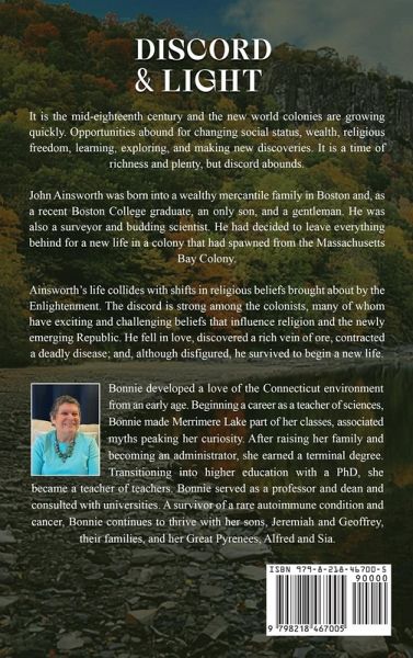 Discord and Light: A Connecticut Colony Novel Discord and Light: A Connecticut Colony Novel is a work of historical fiction set in mid-1700s pre-revolutionary Connecticut. This era was marked by discord, challenges, and change, as the colonies grappled with experimental self-governance and new religious philosophies. Setting: Central Connecticut, a region flourishing with farming and transport, caught between the religious and political tensions of the time. The story unfolds against the backdrop of the Great Awakening and the Wallingford Controversy, as well as the economic and territorial disputes of the era. Main Characters: - John Ainsworth: A Boston-born surveyor and scientist who relocates to Connecticut. - Catherine Carmichael Osborne: The brilliant, well-educated wife of the current minister. - Doctor Daniel Hutton: A respected community leader, doctor, and inventor. - Reverend James Osborne: Catherine's husband and the controversial minister at the center of the Wallingford Controversy. Plot Overview: John Ainsworth arrives in Connecticut to survey properties and investigate ore mining. He forms an unlikely partnership with Catherine Osborne, leading to a complex romantic entanglement. Their relationship is tested by natural disasters, community tensions, and Reverend Osborne's jealousy. Ainsworth's discovery of a rich ore vein is overshadowed when he contracts a deadly fungal disease. Dr. Hutton saves his life through innovative surgery, leaving Ainsworth scarred but alive. As Ainsworth prepares to leave for a new life, an unexpected twist offers a potential new beginning with Catherine. The Future: While recuperating, Ainsworth networks and connects with former colleagues in the Chesapeake Bay area. Intrigued by a Jesuit's stories, he considers a new life where his deformity can be hidden. As Ainsworth prepares to depart, saying goodbyes from his wagon, he suddenly reins in the horses. A figure in men's work clothing steps into the drive. "Hello, there!" he hails. Slowly, the figure turns. It's Catherine, hinting at an unexpected new chapter in their story. This novel blends historical accuracy with compelling fiction, exploring themes of religious conflict, scientific discovery, and personal transformation in colonial America. It sets the stage for future adventures, leaving readers intrigued about the potential paths for Ainsworth and Catherine.