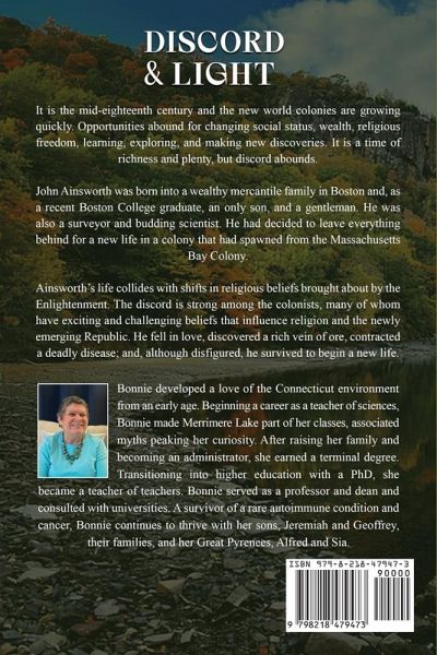 Born in Connecticut, Bonnie Lee Rabe developed a love of the area from an early age. Bonnie's love of learning began with her playing "teacher" as a child and continued throughout her career as a public-school science teacher and administrator, professor and teacher of teachers, consultant, and author. Geologically and meteorologically, Connecticut provided a wealth of scientific models. As Bonnie absorbed the richness of her community and environment, she attended local schools and later became certified to teach through one of the State UniversitiesBonnie began a career as a science teacher in her hometown of Meriden, where she had grown up with urban myths about the black dog who roamed the Hanging Hills. For years she collected stories and brought tales to school. They became exciting parts of her classes. She taught courses in a range of sciences from public kindergarten through middle and high school. Bonnie received many awards in teaching and worked with new teachers, so it was natural for her to train to teach future teachers. After serving as a public-school administrator and raising three sons she returned to learning, earning a PhD in Educational Administration. Dr. Rabe transitioned into higher education and became a teacher of teachers. She developed programs and taught undergraduate, graduate, and doctorate level courses. She served as a professor, dean, and consultant to universities. Dr. Rabe encouraged her future teachers under her care to plan interactive and analytic experiences using All these experiences, knowledge, and interests coalesced into what, after several additional years of research, would become Discord and Light: A Connecticut Colony Novel.A survivor of a rare autoimmune condition, Seronegative Autoimmune Encephalitis, and Endometrial Cancer which triggered the condition; Bonnie continues to thrive with her sons, Jeremiah and Geoffrey, their families, and her Great Pyrenees, Alfred and Sia.