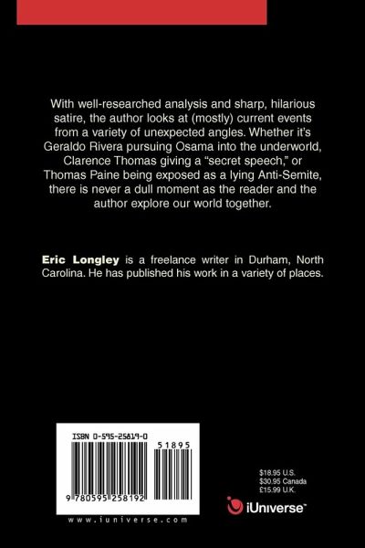 With well-researched analysis and sharp, hilarious satire, the author looks at (mostly) current events from a variety of unexpected angles. Whether it s Geraldo Rivera pursuing Osama into the underworld, Clarence Thomas giving a secret speech, or Thomas Paine being exposed as a lying Anti-Semite, there is never a dull moment as the reader and the author explore our world together.