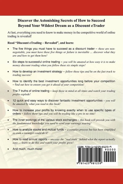 Discover the Astonishing Secrets of How to Succeed Beyond Your Wildest Dream as a Discount eTrader. At last, everything you need to know to make money in the competitive world of online trading is revealed! Read "Discount eTrading - Revealed", and learn: The five things you must have to succeed as a discount trader - these are non-negotiable, you must have these five things or failure is inevitable . discover what they are and how to get them here! Six steps to successful online trading - you will be amazed at how easy it is to make money discount trading when you follow these six simple steps! How to develop an investment strategy - follow these tips and be on the fast track to trading success! How to identify the best investment opportunities long before your competition - find out how to ensure you get it ahead of your competition! The 7 truths of online trading - keep these in mind at all times and watch your trading profits explode! 12 quick and easy ways to discover fantastic investment opportunities - you will be amazed by what you read in this book! How to increase your profits by knowing exactly when to use specific types of orders - follow these tips and you will be trading like a pro in no time! The inner workings of the various stock exchanges - this book will provide you with the fundamental knowledge you need to send your earnings soaring! How to analyze stocks and mutual funds - a complex process but has been simplified so even a teenager could do it! How to read annual reports - uncover the "real truth" behind what the report actually says . learn to do this and watch your profits grow! And much, much more!