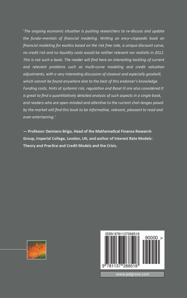 'The ongoing economic situation is pushing researchers to re-discuss and update the fundamentals of financial modeling. Writing an encyclopaedic book on financial modeling for exotics based on the risk free rate, a unique discount curve, no credit risk and no liquidity costs would be neither relevant nor realistic in 2012. This is not such a book. The reader will find here an interesting tackling of current and relevant problems such as multi-curve modeling and credit valuation adjustments, with a very interesting discussion of closeout and especially goodwill, which cannot be found anywhere else to the best of this endorser's knowledge. Funding costs, hints at systemic risk, regulation and Basel III are also considered. It is great to find a quantitatively detailed analysis of such aspects in a single book, and readers who are open-minded and attentive to the current challenges posed by the market will find this book to be informative, relevant, pleasant to read and even entertaining.' - Professor Damiano Brigo, Head of the Mathematical Finance Research Group, Imperial College, London, UK, and author of Interest Rate Models: Theory and Practice and Credit Models and the Crisis.