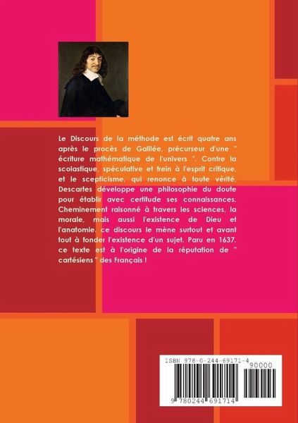 Le Discours de la méthode est écrit quatre ans après le procès de Galilée, précurseur d'une " écriture mathématique de l'univers ". Contre la scolastique, spéculative et frein à l'esprit critique, et le scepticisme, qui renonce à toute vérité, Descartes développe une philosophie du doute pour établir avec certitude ses connaissances. Cheminement raisonné à travers les sciences, la morale, mais aussi l'existence de Dieu et l'anatomie. ce discours le mène surtout et avant tout à fonder l'existence d'un sujet. Paru en 1637. ce texte est à l'origine de la réputation de " cartésiens " des Français !