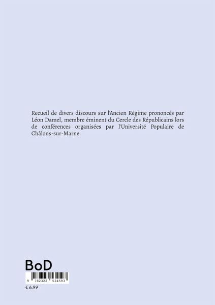 Recueil de divers discours sur l'Ancien Régime prononcés par Léon Damel, membre éminent du Cercle des Républicains lors de conférences organisées par l'Université Populaire de Châlons-sur-Marne.