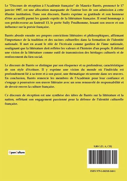 Le "Discours de réception à l¿Académie française" de Maurice Barrès, prononcé le 17 janvier 1907, est une allocution marquante de l'auteur lors de son admission à cette illustre institution. Dans son discours, Barrès exprime sa gratitude et son honneur d'être accueilli parmi les grands esprits de la littérature française. Il rend hommage à son prédécesseur au fauteuil 13, le poète Sully Prudhomme, louant son ¿uvre et son influence sur la poésie française. Barrès aborde ensuite ses propres convictions littéraires et philosophiques, affirmant l'importance de la tradition et des racines culturelles dans la formation de l'identité nationale. Il met en avant le rôle de l'écrivain comme gardien de l'âme nationale, soulignant que la littérature doit refléter les valeurs et l'histoire d'un peuple. Il défend une vision de la littérature comme outil de transmission des héritages culturels et de renforcement du lien social. Le discours de Barrès se distingue par son éloquence et sa profondeur, caractéristique de son style d'écriture. Il y exprime une vision du monde où l'individu est profondément lié à sa terre et à son passé, une thématique récurrente dans ses ¿uvres. En conclusion, Barrès remercie les membres de l'Académie pour leur confiance et s'engage à poursuivre son ¿uvre littéraire avec un sens renouvelé de responsabilité et de devoir envers la culture française. Ce discours de réception est une synthèse des idées de Barrès sur la littérature et la nation, reflétant son engagement passionné pour la défense de l'identité culturelle française.