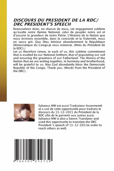 Renouvelons donc, en chacun de nous, cet engagement sublime qu'exalte notre Hymne National, celui de peupler notre sol et d'assurer la grandeur de notre Patrie. L'Histoire de la Nation que nous écrivons ensemble, dans la concorde et la fraternité, nous en saura gré. Que Dieu bénisse abondamment la République Démocratique du Congo.Je vous remercie. (Mots du Président de la RDC)./ Let us therefore renew, in each of us, this sublime commitment that is exalted by our National Anthem, that of populating our soil and ensuring the greatness of our Fatherland. The History of the Nation that we are writing together, in harmony and brotherhood, will be grateful to us. May God abundantly bless the Democratic Republic of the Congo. Thank you. (Words from the President of the DRC) .