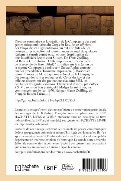 Discours sommaire sur la création de la Compagnie des cent gardes suisses ordinaires du Corps du Roy, de ses officiers, des temps, de ses augmentations qui ont esté faites de ses derniers... les objections et remontrances au sujet de quelques réglemens surpris contre eux... et une récapitulation de tous les officiers desdits cent Suisses. De Frans Zwilling, dit Besson L. Edelman... Cette impression, tirée en partie de la seconde du livre intitulé "Entretien sur la création de la mesme Compagnie desdits cent Suisses", plus correcte que les précédentes. Troisième impression. [ - Raisons et remonstrances de M. le capitaine colonel de la Compagnie des cent gardes suisses ordinaires du Corps du Roy et des officiers d'iceux, sur des prétentions d'aucuns MM. les capitaines des gardes escossois et françois du Corps, présentées à S. M., sous son bon plaisir, et à MMgrs les ministres, au commencement de l'an 1670. Fait par Frantz Zwilling, dit François Besson l'aisné, ...] Date de l'édition originale: 1676 Le présent ouvrage s'inscrit dans une politique de conservation patrimoniale des ouvrages de la littérature Française mise en place avec la BNF. HACHETTE LIVRE et la BNF proposent ainsi un catalogue de titres indisponibles, la BNF ayant numérisé ces oeuvres et HACHETTE LIVRE les imprimant à la demande. Certains de ces ouvrages reflètent des courants de pensée caractéristiques de leur époque, mais qui seraient aujourd'hui jugés condamnables. Ils n'en appartiennent pas moins à l'histoire des idées en France et sont susceptibles de présenter un intérêt scientifique ou historique. Le sens de notre démarche éditoriale consiste ainsi à permettre l'accès à ces oeuvres sans pour autant que nous en cautionnions en aucune façon le contenu. Pour plus d'informations, rendez-vous sur www.hachettebnf.fr