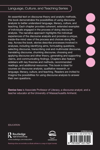 An essential text on discourse theory and analytic methods, this book demonstrates the possibilities of using discourse analysis to better understand language, literacy, culture, and teaching. Each chapter provides coherent, extended examples of individuals engaged in the process of doing discourse analysis. The narrative approach highlights the individual experiences of the discourse analysts and provides a unique, inside-the-mind view of the process and choices along the way. Across the book, stories describe processes involved in analyses, including identifying aims, formulating questions, selecting discourse, transcribing oral and multimodal discourse, translating discourse, chunking discourse, choosing and applying discourse and other theory, generating and supporting claims, and communicating findings. Chapters also feature sidebars with key theories and methods, recommended readings, and additional resources. This book is ideal for courses on discourse analysis, qualitative research, or language, literacy, culture, and teaching. Readers are invited to imagine the possibilities for using discourse analysis to answer their own questions.