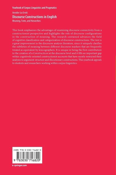 This book emphasizes the advantages of examining discourse connectivity from a constructionist perspective and highlights the role of discourse configurations in the construction of meaning. The research contained advances the field of cognitive classification and categorization of discourse constructions. The text is a great improvement in the discourse analysis literature, since it uniquely clarifies the subtleties of meaning between different discourse markers that are frequently treated as equivalent by lexicographers. It is unique in being the first contribution to the creation of a Constructicon at the discourse level and it fills an important gap within cognitively oriented constructionist accounts that have mostly restricted their analyses to argument-structure and illocutionary constructions. This yearbook appeals to students and researchers working within corpus linguistics.