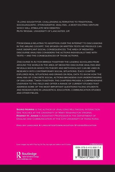 From emails relating to adoption over the Internet to discussions in the airline cockpit, the spoken or written texts we produce can have significant social consequences. The area of Mediated Discourse Analysis considers texts in their social and cultural contexts to explore the actions individuals take with texts - and the consequences of those actions. Discourse in Action: brings together leading scholars from around the world in the area of Mediated Discourse Analysis reveals ways in which its theory and methodology can be used in research into contemporary social situations explores real situations and draws on real data in each chapter shows how analysis of texts in their social contexts broadens our understanding of the real world. Taken together, the chapters provide a comprehensive overview to the field and present a range of current studies that address some of the most important questions facing students and researchers in linguistics, education, communication studies and other fields.