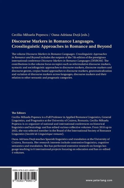 Foreword - List of Contributors - Adriana Costachescu: How the Study of Discourse Markers Changes Pragmatic Theories of Discourse - Chiara Ghezzi: Adunque and Dunque in Old Italian between Free and Patterned Variation: The Role of English Translation in Pragmatic Analysis - Pierre Lejeune/Amália Mendes: A Study on the French Functional Equivalents of some Modal and Metadiscursive Uses of the European Portuguese Marker lá - Federica Cominetti/Doriana Cimmino: The Semantic and Pragmatic Meanings of Italian davvero through Text Types - Viviana Masia: The Evidentiality Dimension of the Italian Discourse Marker sai between Subjectification and Intersubjectification Processes - Claudia Timoci: The Use of tii, ti i, vezi, vede i and în elegi, în elege i as Discourse Markers in Spoken Romanian. A Quantitative Analysis - Anna de Marco/Emanuela Paone: Discourse Markers in Complaints and Apologies: A Comparison between Native and Non- Native Speakers of Italian - Rogelio Nazar/Irene Renau/Hernán Robledo: Dismark and Text·a·Gram: Automatic Identification and Categorization of Discourse Markers in Texts - Bianca Maria Alecu: Digital Discourse Markers in Romanian Forum Communication: The Case of welp, TBH (to be honest) and TBF (to be fair) - Heejung Kim: Reformulation Markers, Linguistic Typology and Rhetorical Conventions: The Case of Spanish and Korean - Fátima Silva/Fátima Oliveira/Ana Sofia Pinto: Fátima Silva, Fátima Oliveira, Ana Sofia Pinto - Anna de Marco/Mariagrazia Palumbo: Interactional Discourse Markers in a Corpus of Italian Migrants in Munich - Alice Ionescu: Discourse Markers si vous voulez in French and daca vre i in Romanian: A Comparative Analysis - Louise Behe: Même Discourse Marker? A Study of Its Argumentative Uses