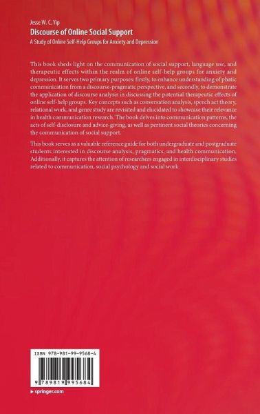 This book sheds light on the communication of social support, language use, and therapeutic effects in the context of online self-help groups for anxiety and depression. The book has two major purposes: the first is to enhance understanding of the phatic communication through a discourse-pragmatic perspective; and the second is to demonstrate the use of discourse analysis to discuss the potential therapeutic effects of the online self-help groups. Key concepts, including genre study, speech act theory, relational work and discourse analysis, are revisited and elucidated to show their applicability in health communication research. This book focuses on the topics of communication patterns, the communicative acts of self-disclosure and advice-giving, and relevant social theories in the communication of social support.