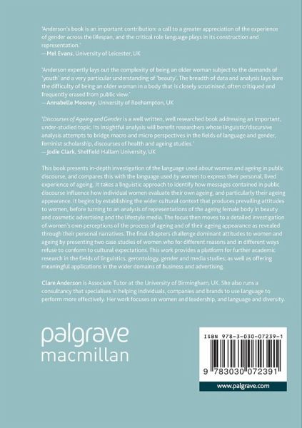 This book presents in-depth investigation of the language used about women and ageing in public discourse, and compares this with the language used by women to express their personal, lived experience of ageing. It takes a linguistic approach to identify how messages contained in public discourse influence how individual women evaluate their own ageing, and particularly their ageing appearance. It begins by establishing the wider cultural context that produces prevailing attitudes to women, before turning to an analysis of representations of the ageing female body in beauty and cosmetic advertising and the lifestyle media. The focus then moves to a detailed investigation of women's own perceptions of the process of ageing and of their ageing appearance as revealed through their personal narratives. The final chapters challenge dominant attitudes to women and ageing by presenting two case studies of women who for different reasons and in different ways refuse to conform toculturalexpectations. This work provides a platform for further academic research in the fields of linguistics, gerontology, gender and media studies; as well as offering meaningful applications in the wider domains of business and advertising.