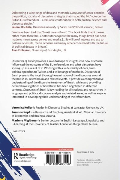 "Addressing a wide range of data and methods, Discourses of Brexit decodes the political, social and discursive strategies that shaped the 'No' vote on the British EU referendum ... a valuable contribution to both political science and discourse studies."