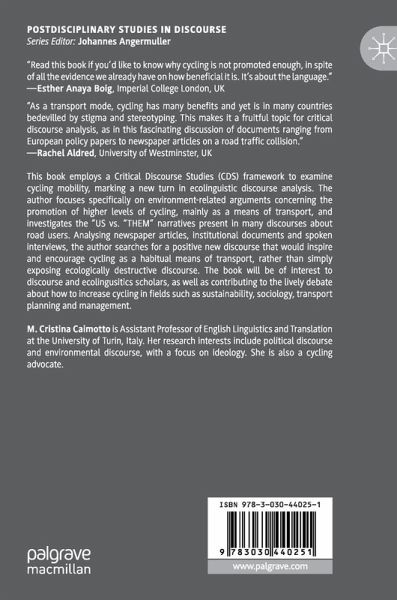 This book employs a Critical Discourse Studies (CDS) framework to examine cycling mobility, marking a new turn in ecolinguistic discourse analysis. The author focuses specifically on environment-related arguments concerning the promotion of higher levels of cycling, mainly as a means of transport, and investigates the "US vs. "THEM" narratives present in many discourses about road users. Analysing newspaper articles, institutional documents and spoken interviews, the author searches for a positive new discourse that would inspire and encourage cycling as a habitual means of transport, rather than simply exposing ecologically destructive discourse. The book will be of interest to scholars of discourse and ecolinguistics, as well as contributing to the lively debate about how to increase cycling in fields such as sustainability, sociology, transport planning and management.
