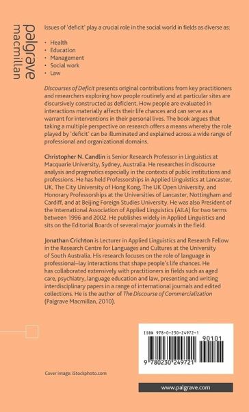 Key practitioners and researchers explore how people routinely and at particular sites are discursively constructed as deficient in ways that may affect their life chances. The book offers examples of how adopting multiple perspectives on research can provide a rich explanatory analysis of the construct of 'deficit' in a range of domains.