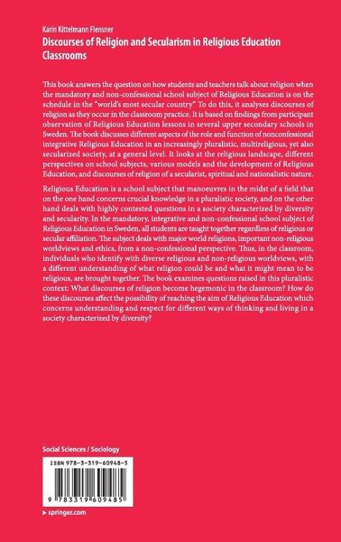 Religious Education is a school subject that manoeuvres in the midst of a field that on the one hand concerns crucial knowledge in a pluralistic society, and on the other hand deals with highly contested questions in a society characterized by diversity and secularity. In the mandatory, integrative and non-confessional school subject of Religious Education in Sweden, all students are taught together regardless of religious or secular affiliation. The subject deals with major world religions, important non-religious worldviews and ethics, from a non-confessional perspective. Thus, in the classroom, individuals who identify with diverse religious and non-religious worldviews, with a different understanding of what religion could be and what it might mean to be religious, are brought together. The book examines questions raised in this pluralistic context: What discourses of religion become hegemonic in the classroom? How do these discourses affect the possibility of reaching the aim of Religious Education which concerns understanding and respect for different ways of thinking and living in a society characterizedby diversity?