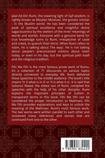 Jalal Ad-Din Rumi, the towering light of Sufi wisdom, is rightly known as Moulavi Ma'anavi, the gnostic scholar - in the Muslim world. He has been considered the peak of spiritual excellence and insightful divine sagaciousness by the seekers of the inner meanings of words and worlds. Everyone with a genuine bend for true knowledge turns to Rumi, irrespective of caste and creed, to quench their thirst. When Rumi refers to Islam, he is talking about The way/. He is not talking about people's preconceived notions about Islam today, or even in his day, but the spiritual path itself and the religious tradition. Fihi Ma Fihi is the most famous prose work of Rumu. It's a collection of 71 discourses on various topics directly connected to everyday life. Rumi delivered these speeches to the middle audience. The book's title means 'In it what is in it' or 'It is what it is'. It is said that Sultanul Walad, the eldest son of Rumi, compiled the speeches with the help of his other disciples; Rumi explains the important principles of Sufism in transparent terms in this book. Fihi Ma Fihi can be considered the proper introduction to Mathnavi. Fihi Ma Fihi provides explanations and keys to unlock the meaning of the Mathnavi. Rumi's most famous work. The two works were written parallel to each other and contained many references and stories that are continued from one to the other.