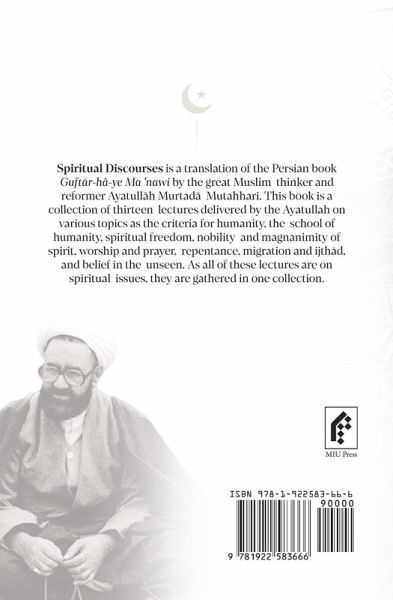 Spiritual Discourses is a translation of the Persian book Guft¿r-hâ-ye Ma 'nawi by the great Muslim thinker and reformer Ayatull¿h Murtad¿ Mutahhari. This book is a collection of thirteen lectures delivered by the Ayatullah on various topics, such as the criteria for humanity, the school of humanity, spiritual freedom, nobility and magnanimity of spirit, worship and prayer, repentance, migration and ijth¿d, and belief in the unseen. All these lectures are on spiritual issues, so they are gathered in one collection.