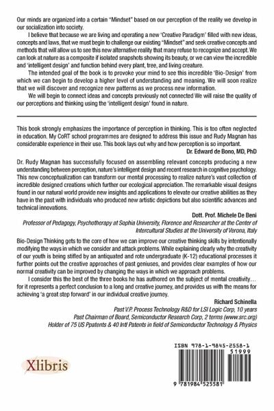 Our minds are organized into a certain mind-set based on our perception of the reality we develop in our socialization into society. I believe that because we are living and operating a new creative paradigm filled with new ideas, concepts, and laws, we must begin to challenge our existing mind-set and seek creative concepts and methods that will allow us to see this new alternative reality that many refuse to recognize and accept. We can look at nature as a composite of isolated snapshots showing its beauty, or we can view the incredible and intelligent design and function behind every plant, tree, and living creature. The intended goal of the book is to provoke your mind to see this incredible bio design from which we can begin to develop a higher level of understanding and meaning. We will soon realize that we will discover and recognize new patterns as we process new information. We will begin to connect ideas and concepts previously not connected. We will raise the quality of our perceptions and thinking using the intelligent design found in nature.