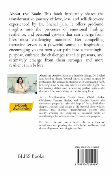 This book intricately shares the transformative journey of love, loss, and self-discovery experienced by Dr. Snehal Jain. It offers profound insights into the processes of emotional healing, resilience, and personal growth that can emerge from life's most challenging moments. Her compelling narrative serves as a powerful source of inspiration, encouraging you to turn your pain into a meaningful purpose, embrace the challenges that life presents, and ultimately emerge from them stronger and more resilient than before. In her story, she also emphasizes the vital importance of recognizing one's self-worth and harnessing inner strength and provides practical tools and strategies to enhance emotional resilience in the face of adversity. While it is true that the challenges we encounter in life may shatter our preconceived illusions and disrupt our sense of stability, they simultaneously create invaluable opportunities for us to rebuild ourselves and foster personal growth. Important features of this book: 1) Throughout this book, you will learn the power of your emotions and how to use/leverage them in your favour 2) Each chapter summarizes the key points on emotions and helps us how to overcome that emotional challenge 3) It provides tools and techniques to heal the emotional pain 4) A technical aspect of how to overcome the emotional challenges is woven into the story form to make it easier to understand