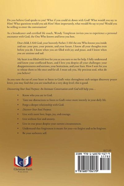 Do you believe God speaks to you? What if you could sit down with God? What would you say to Him? What questions would you ask Him? Most importantly, what would He say to you? Would you be willing to enter the conversation? As a broadcaster and certified life coach, Wendy Templeton invites you to experience a personal encounter with God, the One Who knows and loves you best. Dear child, I Am God, your heavenly Father. I Am the one Who knows you inside and out: your past, your present, and your future. I know all your thoughts even before you do. I know when you are filled with joy and peace, and I know when you are anxious and sad. My heart is so filled with love for you as you turn to me for help. I fully understand and know your conflicted heart, and I love you despite all your challenges: your disappointments and sorrows, your hesitations, and your fears. How I wait for you to release them to Me once and for all. I must ask you, My precious soul, what do you believe? As you tune the ear of your heart to listen to God's voice throughout each unique discovery prayer letter, you may find that you are touched on a very deep level; this is good. Discovering Your Soul Purpose: An Intimate Conversation with God will help you... Know who you are in God. Tune out distractions to listen to God's voice more intently in your daily life. Forge a deeper relationship with God. Discover Your Soul Purpose. Live with more love, hope, joy, and courage. Live without fear and anxiety. Live in true peace despite your current circumstances. Understand that forgiveness is meant for you--to forgive and to be forgiven. Be your authentic self.